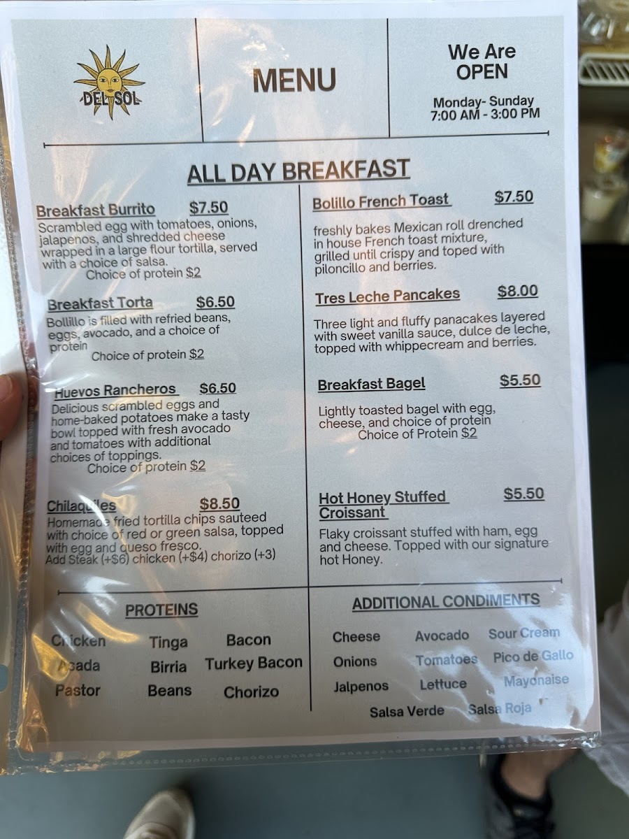 The menu at Del Sol Cafe features a variety of options designed to accommodate different times of day and dining preferences. It is organized into several key sections including drinks, all-day breakfast items, and brunch selections.